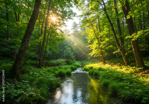 © Star ✨, Fototapeta premium Lush Green Forest Scene: Sunrise Sunlight Filtering Through Trees, Tranquil Creek, Nature Photography