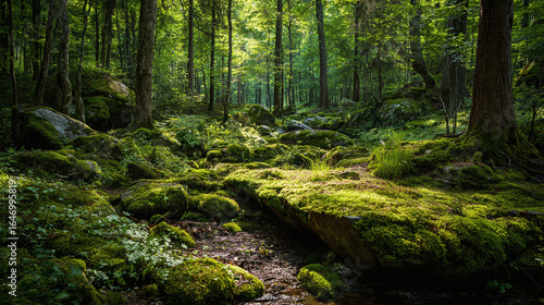 Fototapeta premium Lush, green forest scene with mossy rocks, tall trees, and dappled sunlight...