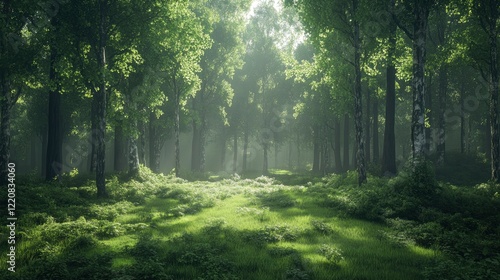 Obraz premium Lush green forest scene with sunlight filtering through trees, creating a...