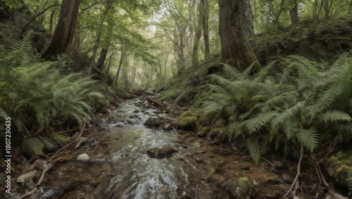© Agus, Fototapeta premium Lush Green Forest Stream with Ferns and Trees.