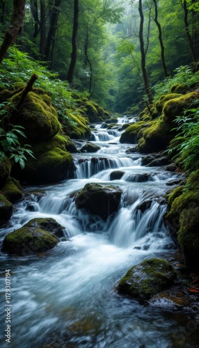 Obraz premium Lush green forest stream with mossy rocks and cascading waterfalls in a...