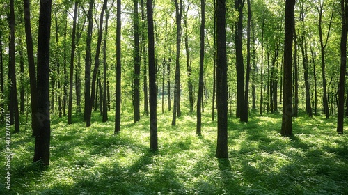 © Abul, Fototapeta premium Lush Green Forest Sunlight Dappled Trees Nature Scenery