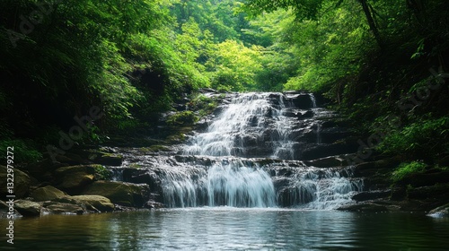 © Muhbahrir ghozali, Fototapeta premium Lush green forest surrounding cascading waterfall, peaceful natural scenery