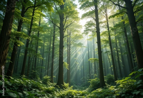 Naklejka premium Lush Green Forest Tall Trees Sunlight Beams - Eco-Friendly Nature Concept...