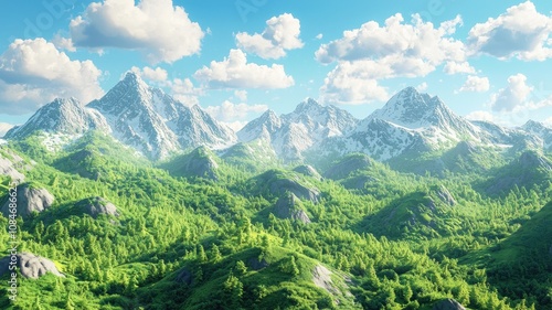 Naklejka premium Lush Green Forest Valley Surrounded by Snow-capped Mountains and Blue Sky