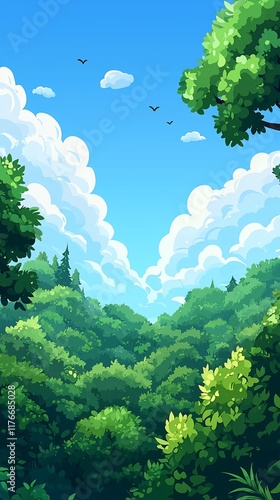 Obraz premium Lush green forest valley under a vibrant blue sky with fluffy clouds and birds.