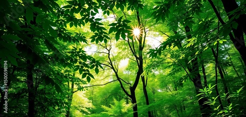 Naklejka premium Lush green forest, vibrant foliage, sunlight dappling through leaves, environment, botanical