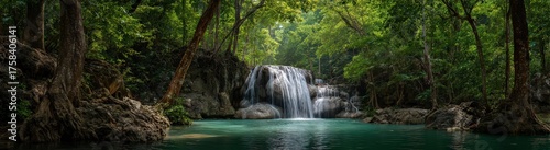 © Rabbani, Fototapeta premium Lush Green Forest Waterfall and Turquoise Pool Under Sunlight Panoramic View