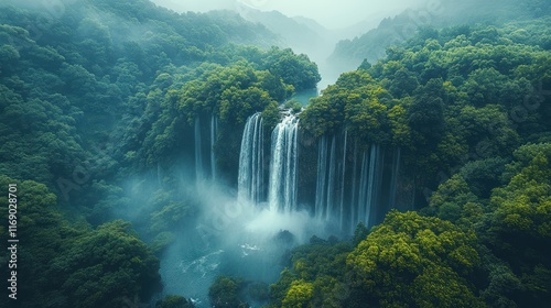 © mochalfin, Fototapeta premium Lush green forest waterfall mist aerial view.