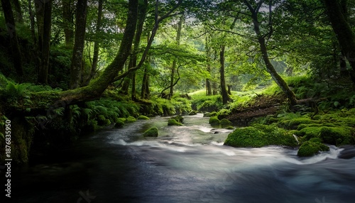Obraz premium lush green forest with a mystical river flowing through a dark atmospheric...