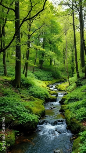 Obraz premium Lush green forest with a small stream flowing through it, trees, nature, water