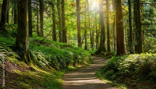 Obraz premium lush green forest with a winding path dappled sunlight creating a magical atmosphere