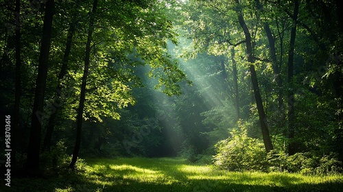 © NATTAKORN, Fototapeta premium Lush Green Forest with Captivating Sunbeams Illuminating the Scenic Landscape