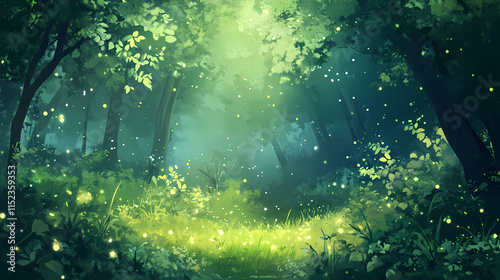 © Thiago, Naklejka premium Lush green forest with dappled sunlight and bokeh effect nature background. Dappled. Illustration