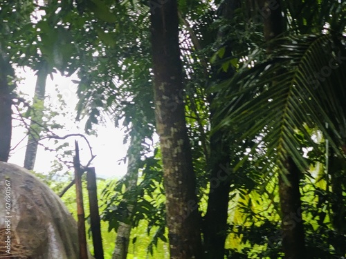 Naklejka premium Lush green forest with dense foliage and tall trees on a bright day