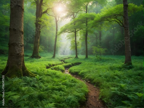 Obraz premium Lush green forest with mountains at sunset, a serene natural landscape