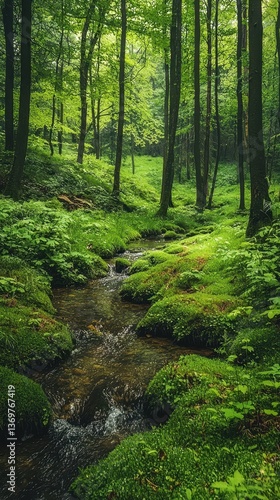 © Kitta Studio, Obraz premium Lush Green Forest with Natural Brook and Peaceful Atmosphere