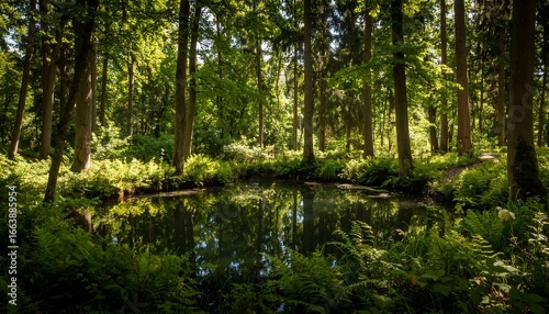 © mentil, Obraz premium Lush Green Forest with Serene Pond and Sunlit Ferns.