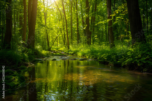 Obraz premium Lush Green Forest with Sun-Dappled Canopy: A Serene Display of...
