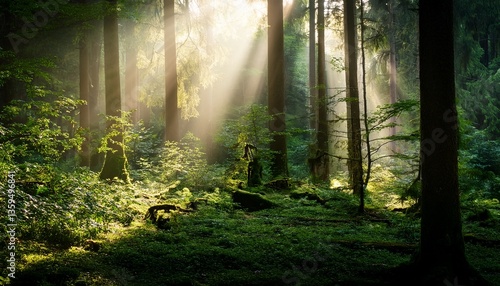 © Luckyjerry, Fototapeta premium Lush green forest with sunbeams filtering through the trees, mystical atmosphere