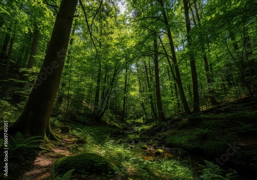 © Shahanara, Fototapeta premium Lush green forest with sunbeams shining through the trees and a small stream flowing through the undergrowth