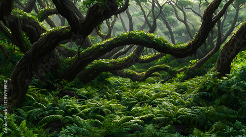 Naklejka premium Lush Green Forest with Sunlight Dappling Through Dense Canopy