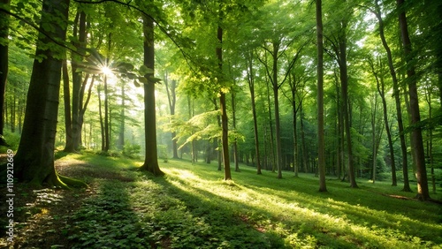 Fototapeta premium Lush green forest with sunlight filtering through