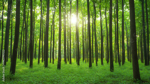 © Gun, Obraz premium Lush Green Forest with Sunlight Filtering Through Tall Trees and Vibrant Understory Plants