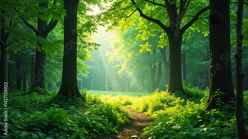 © Konstantin, Fototapeta premium Lush green forest with sunlight filtering through the trees.