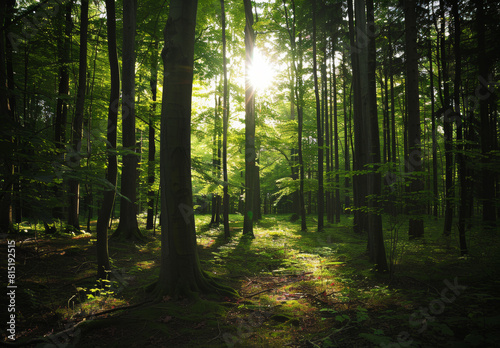 Obraz premium Lush green forest with sunlight filtering through the trees