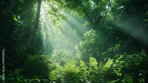 Fototapeta premium Lush green forest with sunlight filtering through the trees
