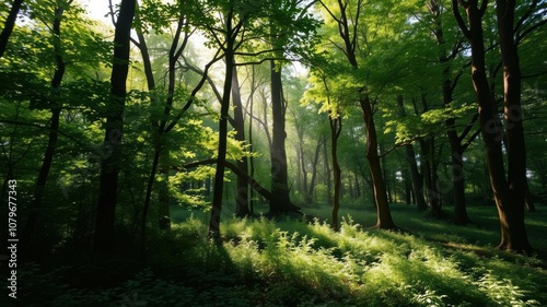 Obraz premium Lush green forest with sunlight filtering through the trees creating a serene...