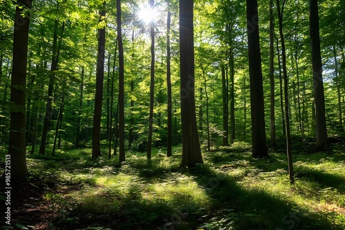 © Daryna Diakova, Naklejka premium Lush green forest with sunlight filtering through the trees, peaceful and natural environment