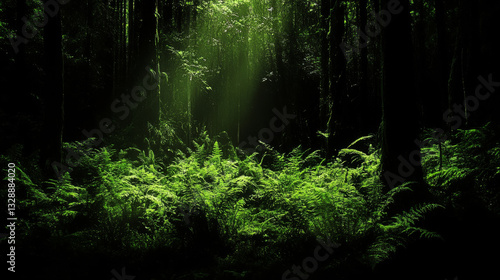Fototapeta premium Lush green forest with sunlight filtering through trees, creating serene...