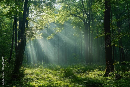 © Image Stoker, Fototapeta premium lush green forest with sunlight filtering through trees peaceful atmosphere