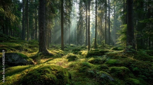 © Aiy JR Stock, Obraz premium Lush Green Forest with Sunlight Rays