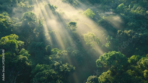 © Ari, Fototapeta premium Lush green forest with sunlight streaming through dense trees, gentle mist in the air, peaceful atmosphere