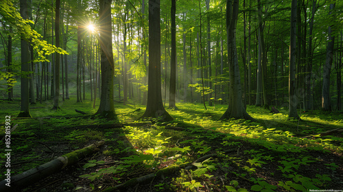 © wasan, Obraz premium Lush green forest with sunlight streaming through the trees