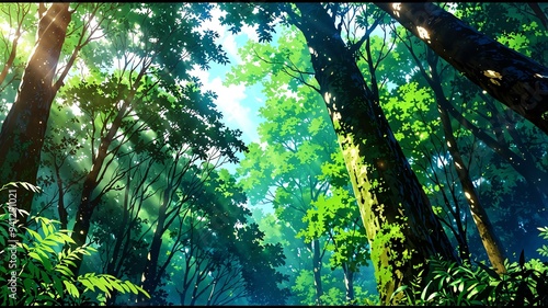 Naklejka premium lush green forest with tall majestic trees and a soft background