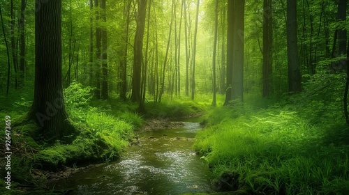 © mirifadapt, Fototapeta premium lush green forest with tall trees and a small stream running through it