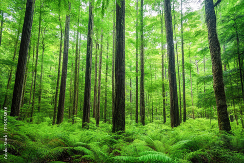 Fototapeta premium Lush green forest with tall trees and ferns in serene natural landscape