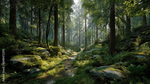 Obraz premium Lush Green Forest with Tall Trees and Mossy Rocks in Morning Light