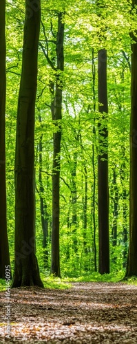 © Manatchaya, Fototapeta premium Lush Green Forest with Tall Trees and Sunlight Filtering Through