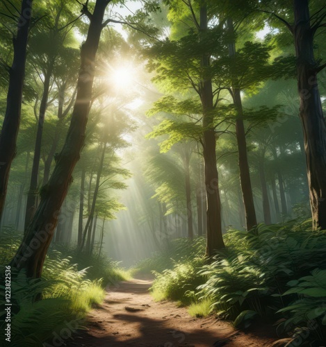 Obraz premium Lush green forest with tall trees and sunlight filtering through leaves,...