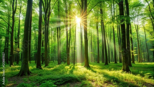 © Watcharapon, Obraz premium Lush green forest with tall trees and sunlight filtering through the branches, nature, woods, trees, flora, greenery