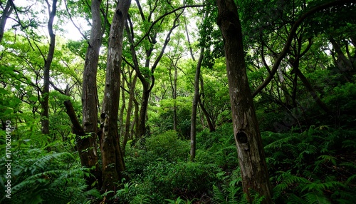 Fototapeta premium Lush green forest with tall trees and undergrowth