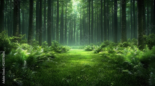 © Thanyaporn, Obraz premium Lush Green Forest with Tall Trees and Vibrant Ferns in Fresh Light