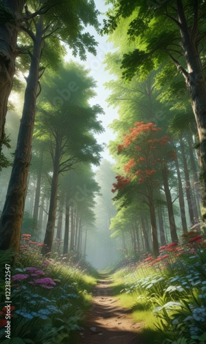 Fototapeta premium Lush green forest with tall trees and vibrant flowers , outdoors, wildflowers