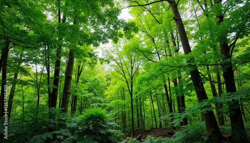 Naklejka premium Lush green forest with tall trees and vibrant foliage