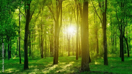 Naklejka premium Lush green forest with tall trees bathed in warm sunlight presents a serene...